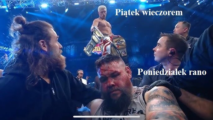 o matko, wolałbym tego nie pamiętać..... taaaaaaaaa, napewno. Od dobrego roku szykują tą grubszą historię Chyba Mox przejdzie faceturn, patrząc na to że od utraty pasa ciągle utapia. No ciekawa ta dynamika będzie, jeszcze w CC Mox vs Claudio. No w AEW nie można się nudzić.   Po co widzowie skoro jest skarbonka z Arabów ? Ej, a czy takie samo podejście nie było jak Vince był kreatywnym, NIECH PRZYJDZIE HUNTER, BĘDZIE LEPIEJ, BO NA PRODUKT OD WĄSACZA NIE DA SIĘ PATRZEĆ.